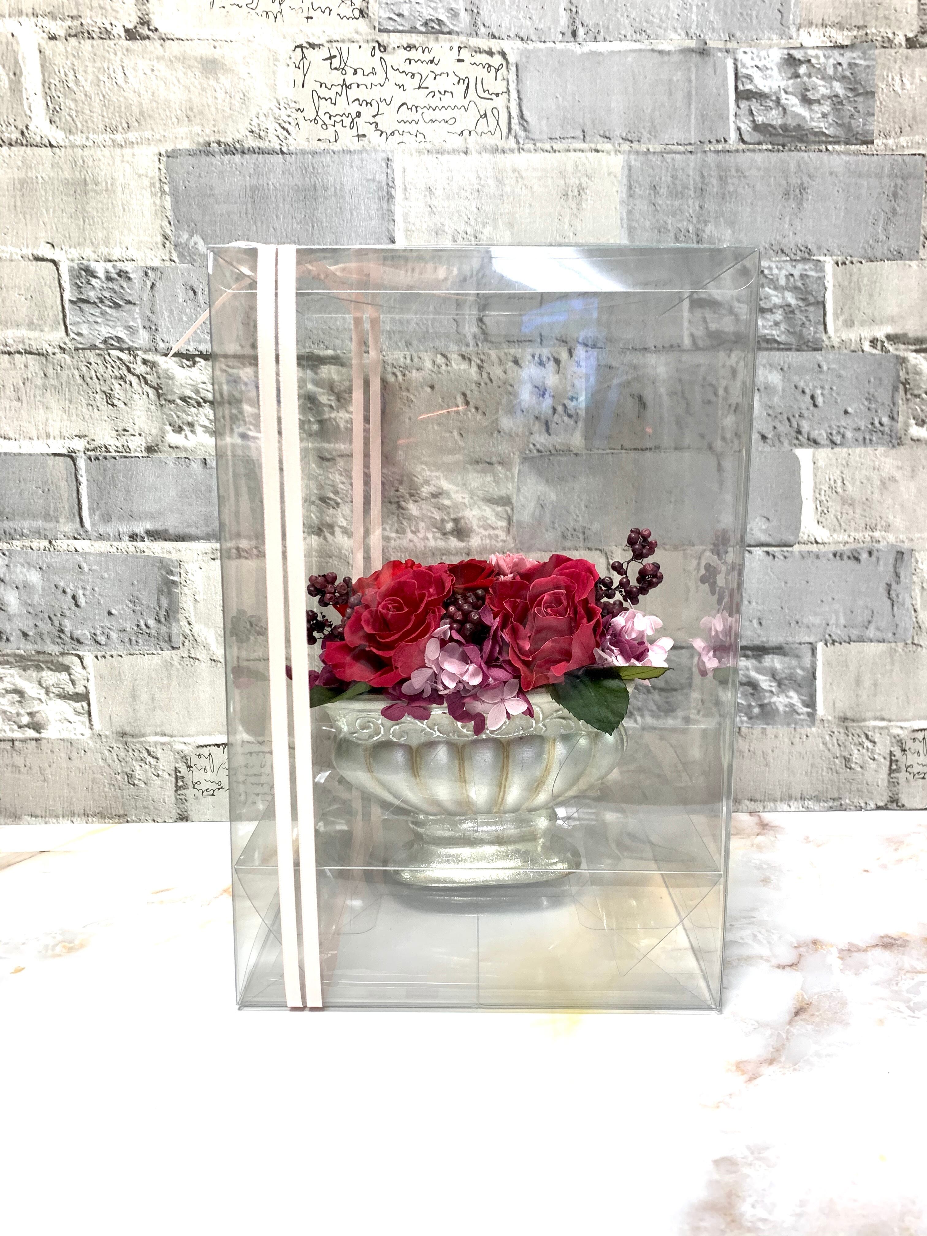 クリアボックス(ポリ塩化ビニール製)にリボンをかけてお届けします。