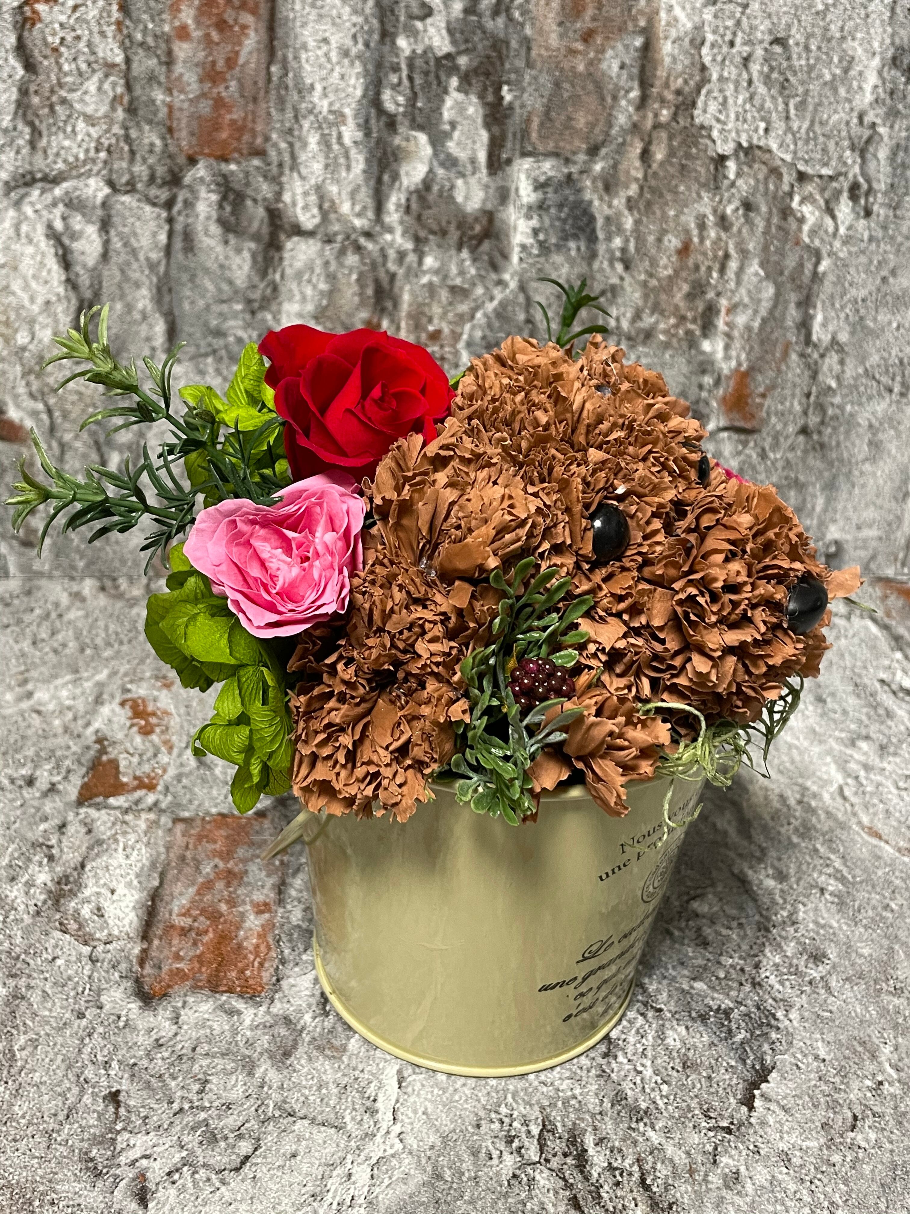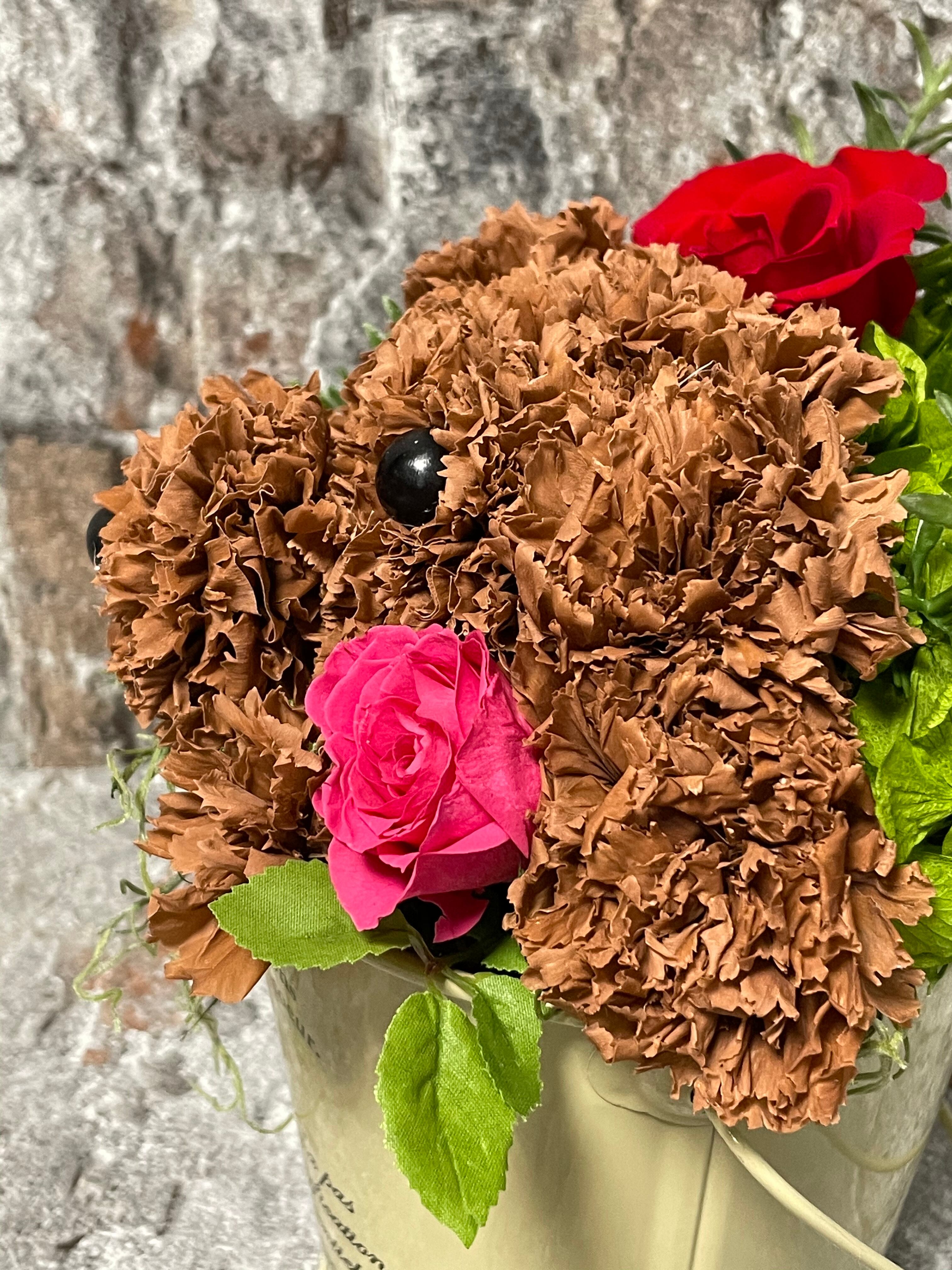 愛らしいペットちゃんを高級で上質なプリザーブドフラワーのカーネーションに特別な技法加えて立体的に仕上げてあり、可愛い表情で見つめてくれます。