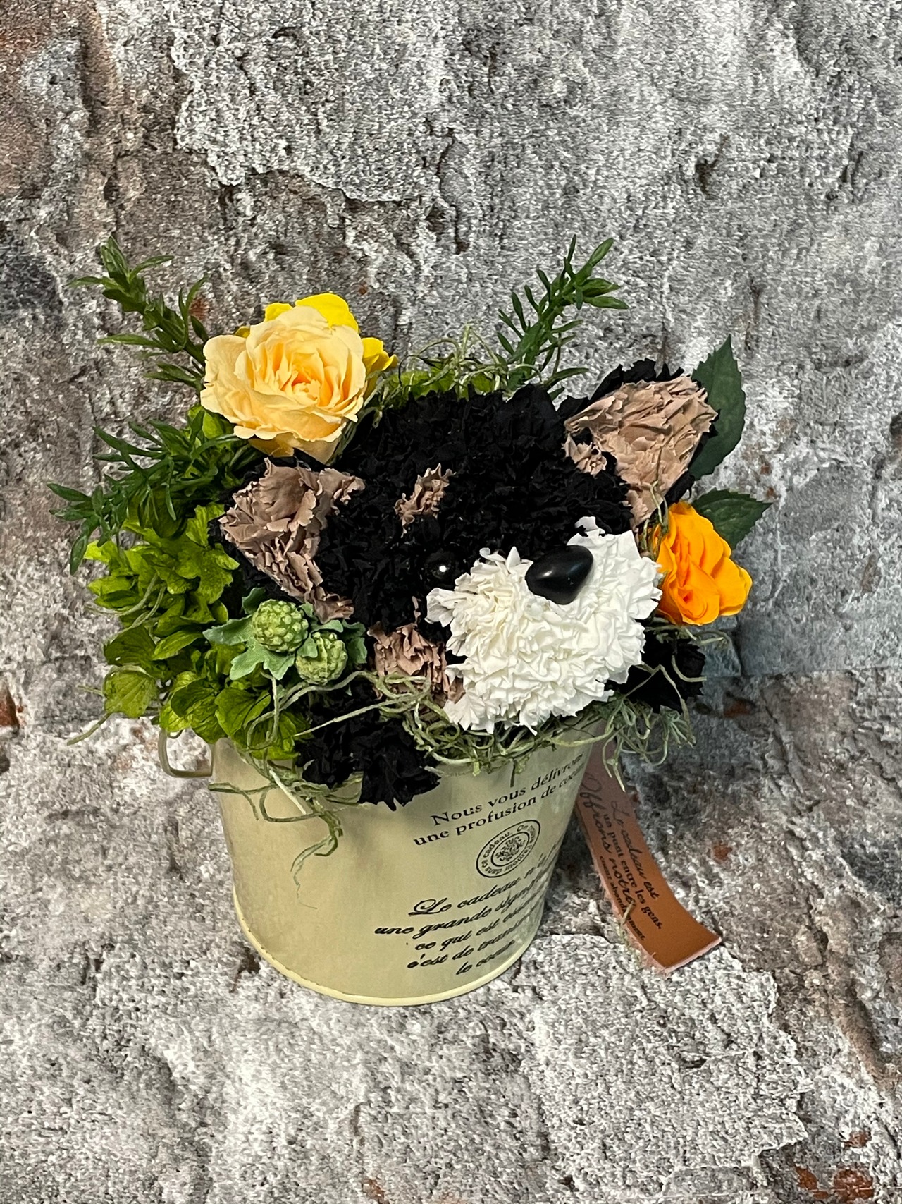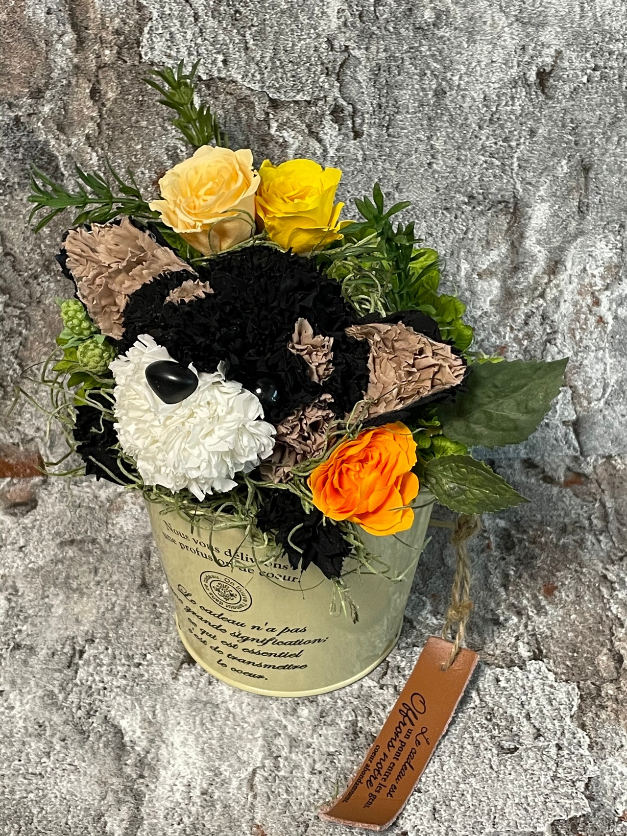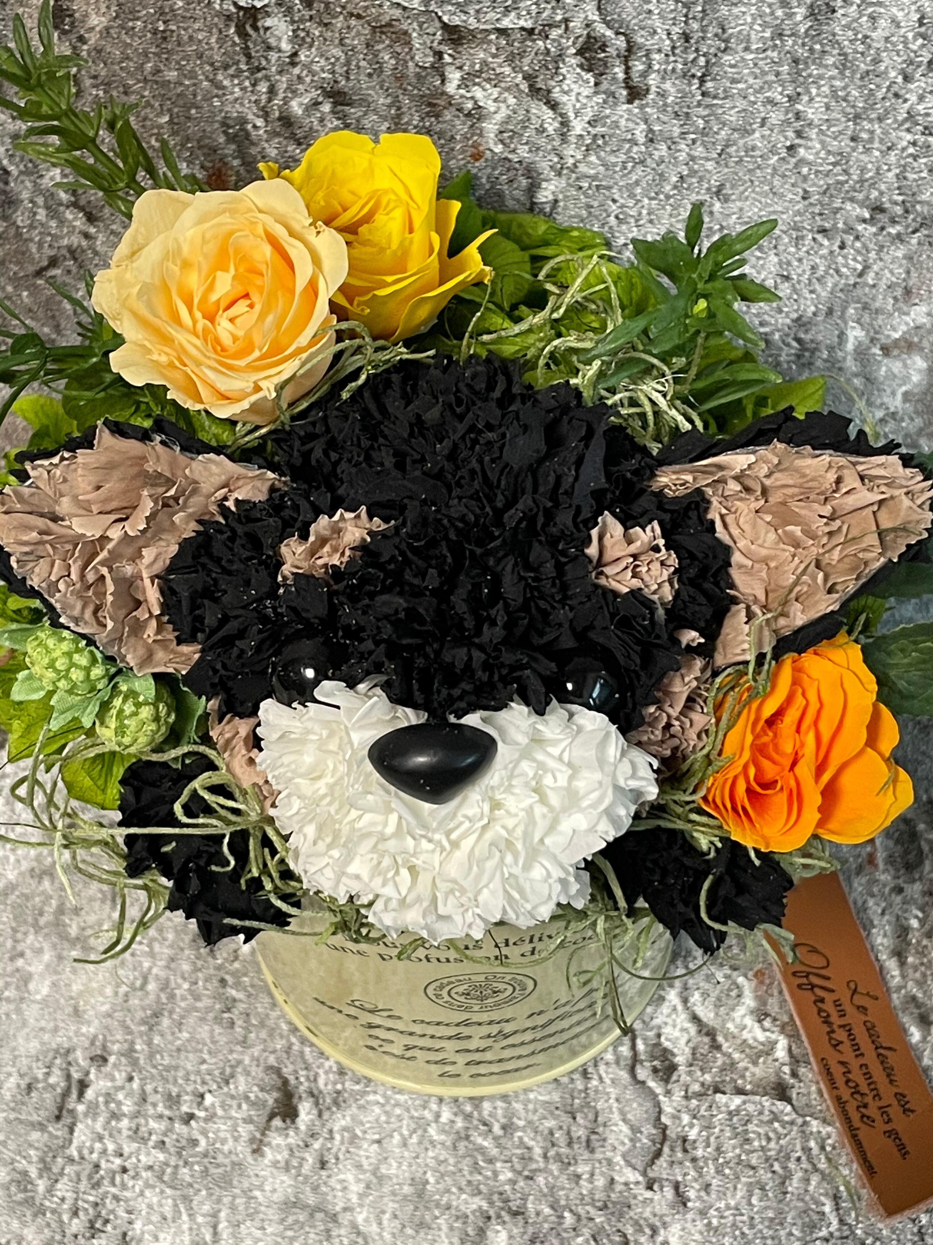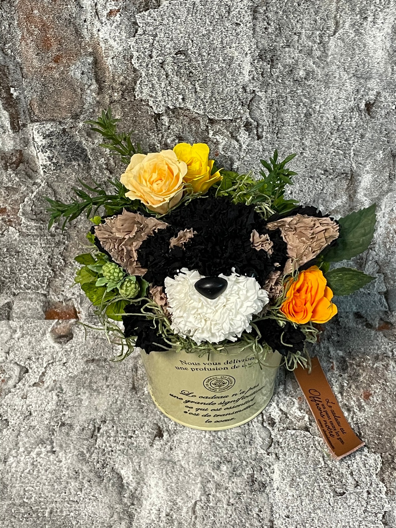 愛らしいペットちゃんを高級で上質なプリザーブドフラワーのカーネーションに特別な技法加えて立体的に仕上げてあり、可愛い表情で見つめてくれます。